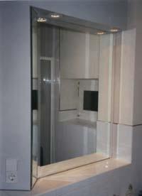 Spiegel Lichtgrau lackiert mit Beleuchtung. Schalter und Steckdose integriert. Säule um 45Grad abgewinkelt. Spiegel umlaufend mit Farcettschliff. Spiegel Vorort angepasst und versiegelt. Maße: 125 x 160 cm