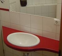 Der Tisch ist rot mit silbernen Effekten und aufgesetztem Waschbecken. Vorort angepasst und versiegelt. Maße: 130 x 45 x 4 cm