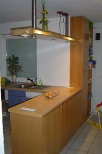 Die Küchentheke und der Hochschrank bestehen aus Spanplatte Buche furniert und wurden an die vorhandene Küche angebaut. Die Lampe besteht aus Multiplex Buche mit sandgestrahltem Glas und indirekter Beleuchtung. Theke, Hochschrank und Lampe sind transparent lackiert.